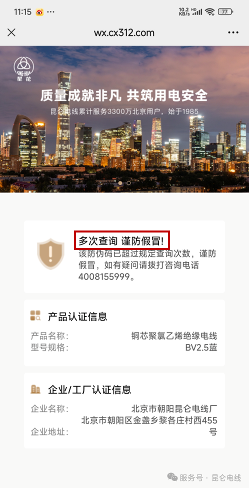 用户刮开防伪码后扫码,如果显示【多次查询 谨防假冒】,则为假冒“星花”牌昆仑电线,如下图所示: